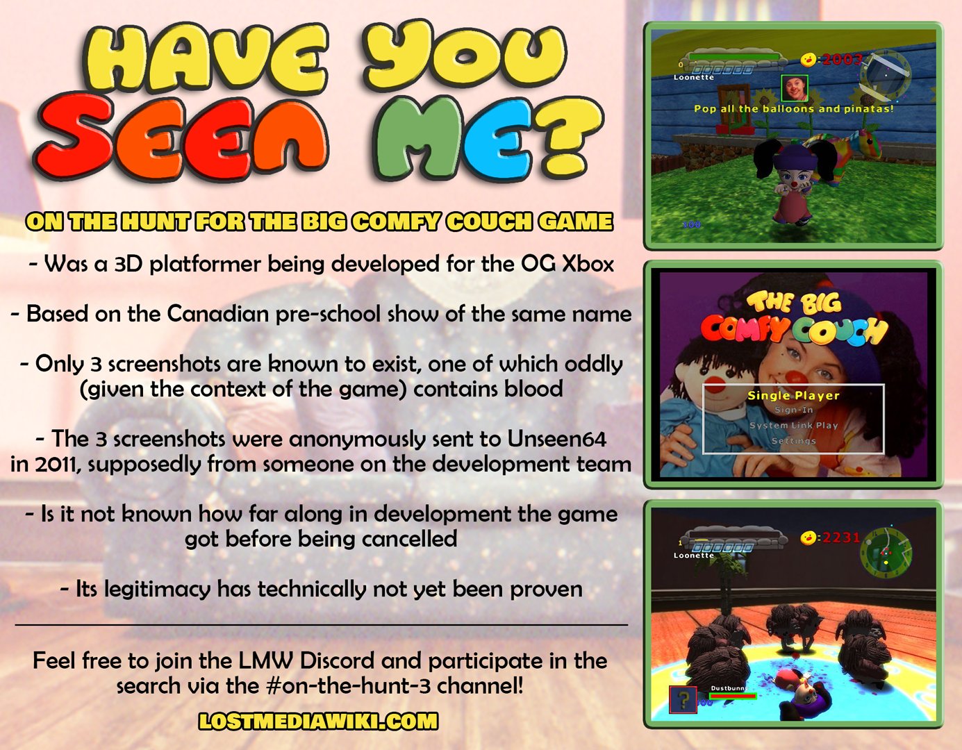 In this episode Loonette is in a jumpy mood. The Big Comfy Couch - Season 1 Ep 3 - All Aboard for Bed The Big Comfy Couch - Season 1 Ep 4 - Knit One Twirl Too The Big Comfy Couch - Season 1 Ep 5 - Upsey Downsey Day. So I found something a couple of years ago on a website called Unseen 64 where they talked about an unreleased game called The Big Comfy Couch.